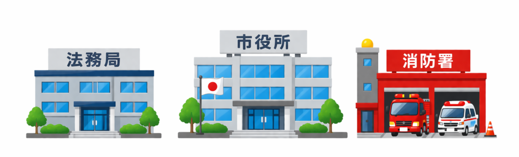 - 市役所・・・建築指導課、道路管理課、都市計画課など